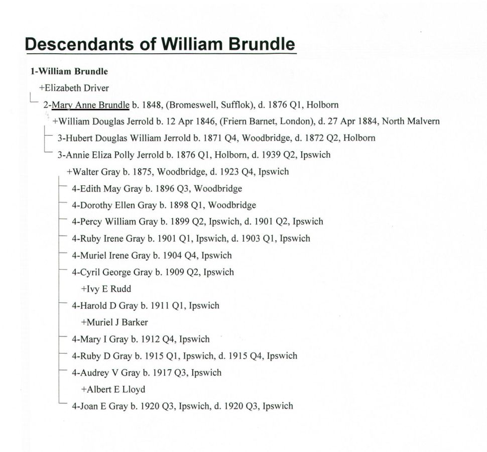 (2) Annie Eliza Polly Jerrold born 1876 Holborn, died 1939, Ipswich. Married Walter Gray born 1875 Woodbridge, died 1923 at Ipswich. They had 11 children. See 1-MaryAnneBrundleDescendants Later to (2) Lavinia Lillie Blanchard, 25th June 1847 in Kensington. She was born in Southwark 1825 and died c.1899 in Fulham. Their children were: (1) Alice Lillie