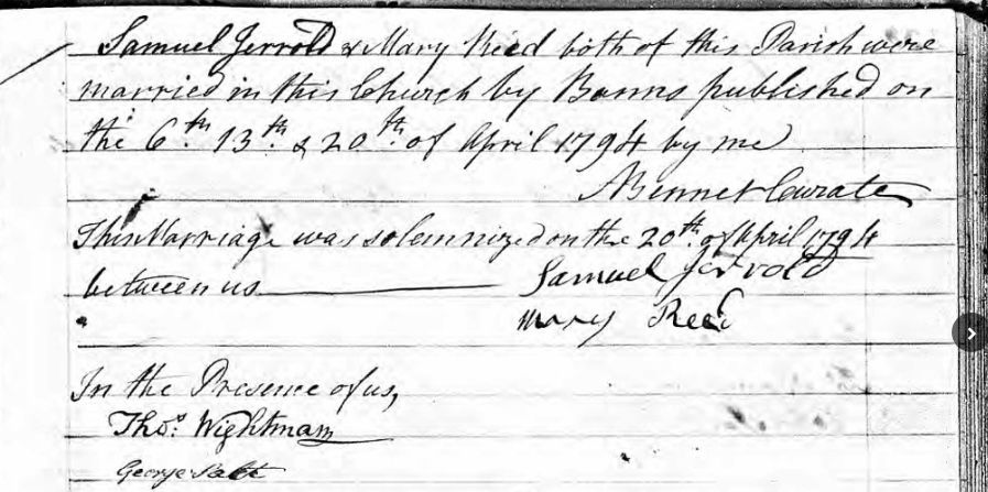 Sources referred to in the text: (WJ): Douglas Jerrold Dramatist and Wit by Walter Jerrold (1914) Hodder & Stoughton (WBJ): The Life of Douglas Jerrold: William Blanchard Jerrold, Bradbury, Evans & Co., London, 1870. (MS): Douglas Jerrold: A Life (1803-1857): Michael Slater, Duckworth 2001 SAMUEL JERROLD According to biographers, Samuel Jerrold was born in 1749 and claimed to be the son of a prosperous Hackney man, a ‘large dealer in horses at a time when horses were much sort after due to the wars and the descendent of yet richer forefathers’ (WBJ, MS). However the IGI index and Ancestry.com only lists a Samuel Jerrold born on 2nd December, 1743, son of Samuel and Sarah Jerrold and Christened on 10th January, 1744 in St Dionis, Backchurch, London. Samuel was a strolling player. At the turn of the 18th century the strolling actor was considered a vagabond. Possibly he was cast off by his family and turned player to survive or he may have been stage-struck and ran away to join the strolling players. He frequently referred to having ‘played in a barn upon an estate that was rightfully his own’ (WBJ, MS). Samuel married first of all Mary Carr on 23rd January, 1772 in St Giles Cripple gate (MY) The register reads: